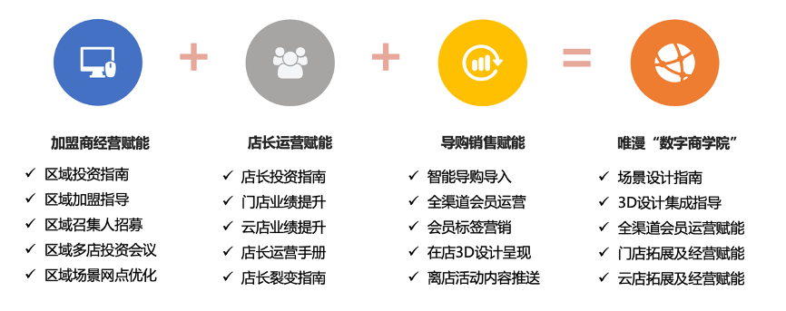 通過加盟商經(jīng)營賦能,規(guī)范投資運營、加盟指導、區(qū)域召集人招募等,強化加盟商經(jīng)營賦能;通過門店運營手冊、云店運營指導等,推動店長運營賦能;通過智能導購導入、會員標簽營銷、在店3D設(shè)計呈現(xiàn)等,全面推動導購銷售賦能;突出場景設(shè)計指南、3D設(shè)計集成等,通過“數(shù)字商學院”對區(qū)域運營大賦能。
