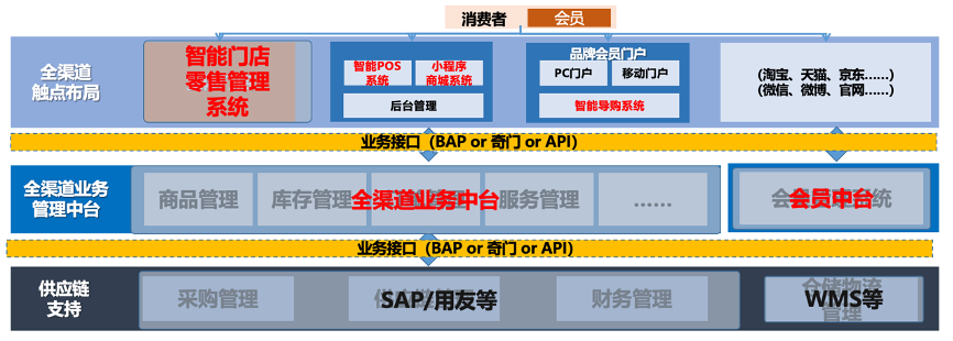 1)大總部:ERP升級后的全渠道業(yè)務(wù)中臺+大會員中臺+WMS+SAP+……