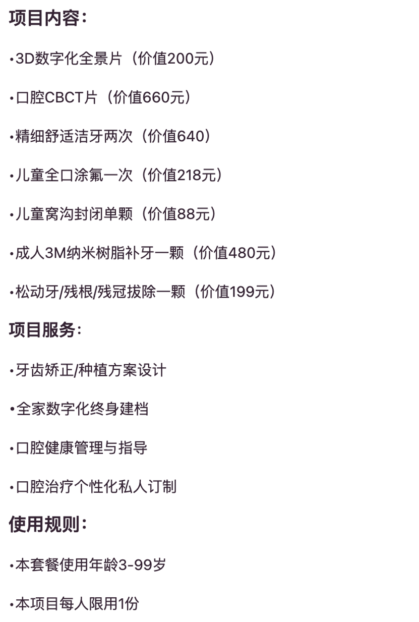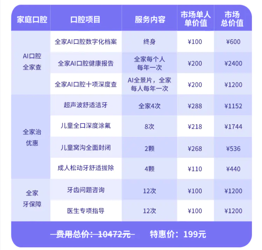 考慮到口腔消費屬于低頻、高價格的消費,韜慧咨詢建議億大全面激活“家庭口腔卡”消費,延續現有的AI口腔數字化檢查、AI口腔健康報告等口腔優惠服務,增加潔牙、涂氟、拔牙等常規優惠服務,同時放大醫患社群價值,提供牙齒問題咨詢、醫生專項指導等口腔在線服務,提升醫患交流頻率,大力提升口腔個人用戶及家庭的“消費黏性”。