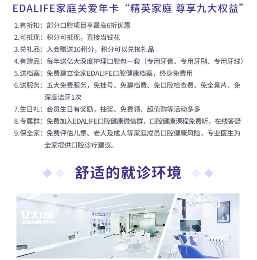 億大EDA-Life全生命周期服務套餐,涵蓋數字化口腔檢查、潔牙、涂氟、補牙等多種服務,更涵蓋了兒童、成人等多類口腔服務,這,大大延展了口腔服務周期,極大提升了用戶消費黏性,同時與家庭卡消費等緊密結合,大大提升了口腔服務的復購,延長了億大會員的口腔服務周期。