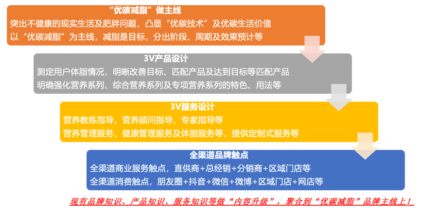 對于“輕天下”,韜慧咨詢認為,其“全渠道經營提升”其要點在于持續(xù)創(chuàng)造“賦能”,以“優(yōu)碳減脂”做主線,點亮“優(yōu)碳生活”;以3V健康管理主張,搭建集合式產品及服務;更打通商業(yè)伙伴、朋友圈、抖音等全渠道觸點,讓全渠道賦能可落地 & 可執(zhí)行。