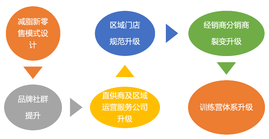 1)樣板區(qū)域打造。選擇設立“運營服務公司”、高業(yè)績成交額、高價值認同度、高業(yè)務配合度的區(qū)域;培育金牌直供商,升級現(xiàn)有門店,賦能渠道商拓展分銷,增強“門店減脂消費體驗”。