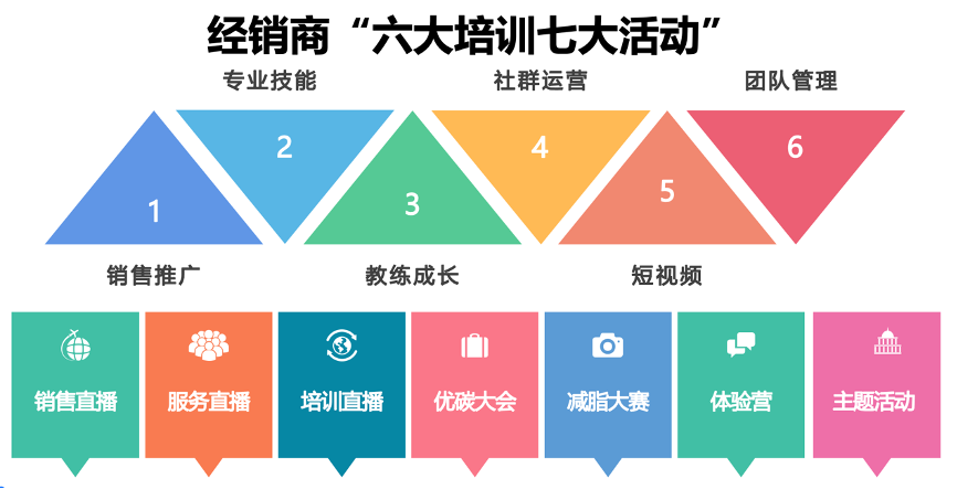“三大訓練營”和“教練培訓”應作為“輕天下”分銷培訓的基礎,“優(yōu)碳 減脂體驗營”作為用戶教育的基礎,“優(yōu)碳營養(yǎng)大會”作為經銷商傳幫帶的“大亮點”,點亮B端分銷裂變和C端消費忠誠!