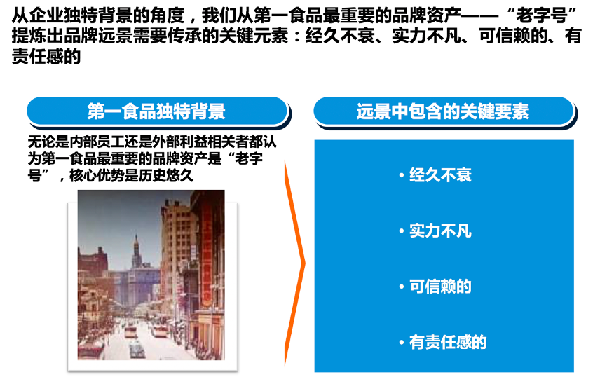 經過前期與高層的多次溝通,我們認為“第一食品”擁有優秀的“老字號品牌活化基因”,擁有食品零售行業的優質要素,確定了“第一食品”的品牌遠景的核心要素。