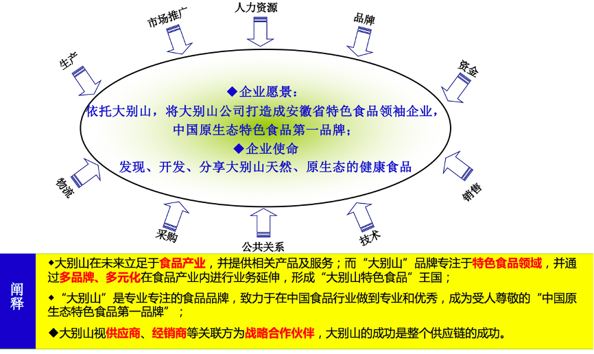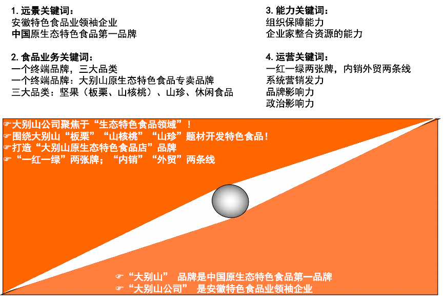 經過與高層的深入溝通,雙方共同明確了“大別山”公司愿景與使命陳述,明確依托當地的資源,快速成長為安徽省特色食品領袖企業,成為中國原生態特色食品第一品牌。