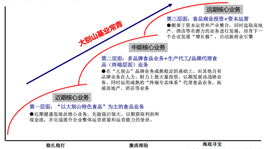 為推進食品業務的發展,我們確定近期以“大別山特色食品”為主的食品業務,中期以“多品牌食品業務+生產代工/品牌代理食品(終端層面)業務”為主的核心業務,遠期以“食品商業投資+資本運營”為主的核心業務