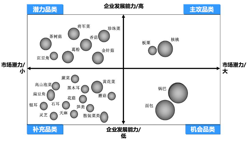 根據對食品市場潛力和大別山發展能力的綜合分析,項目組建議大別山以板栗、核桃為主攻品類,山珍等為潛力品類,鍋巴、面包為機會品類,黃花菜、豆角等為補充品類