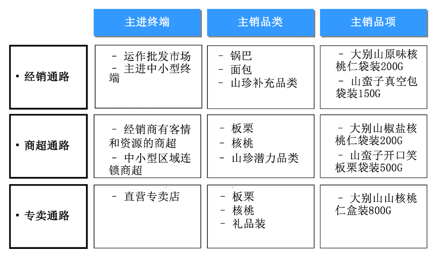 1)“大渠道構建”:結合大別山公司特點,創新“大別山食品經銷商合作模式選擇”,積極開設線下區域市場經銷商,發展網絡代理商及個人代理等,建立健全經銷商渠道、商超渠道和連鎖專賣渠道等體系。