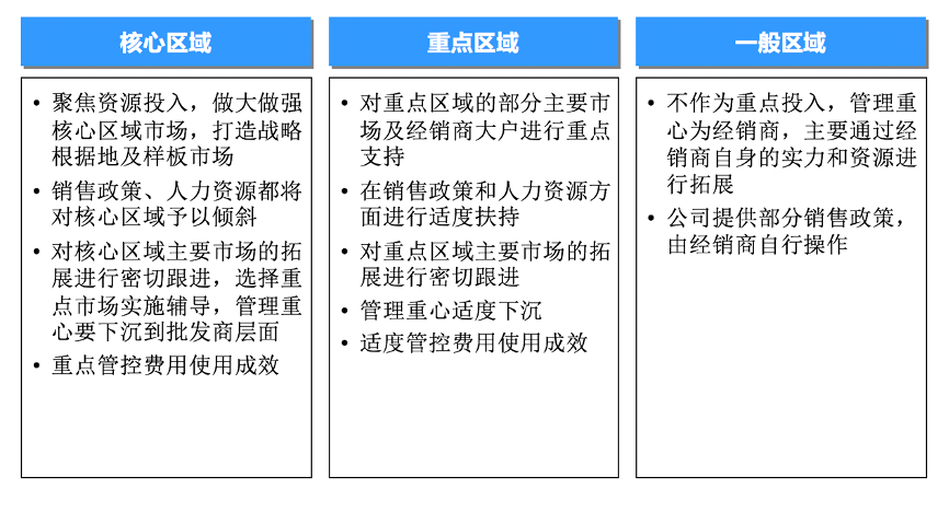2)大別山食品區域市場可劃分為核心區域、重點區域和一般區域,再針對不同區域劃分出不同城市,針對不同區域及城市采取不同政策,前期核心區域以六安等安徽市場為主,中期強化長江以北市場的“全渠道分銷”,后期強化“全國化擴張”。