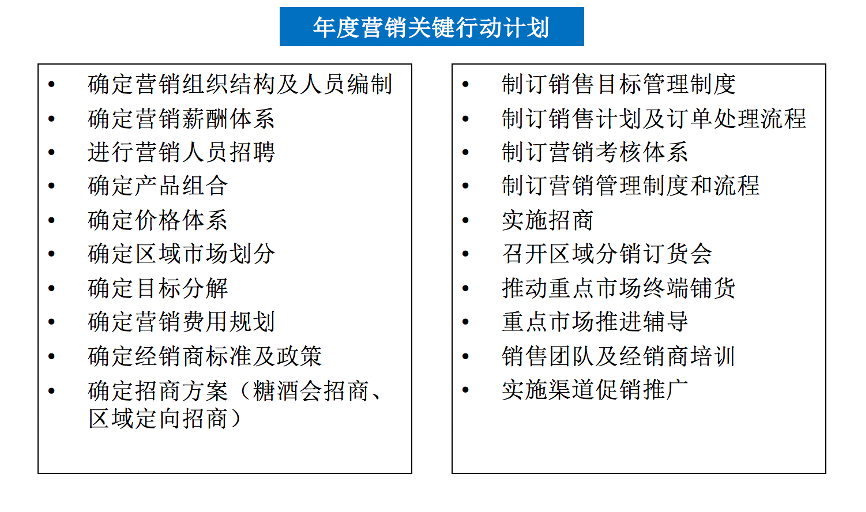 制訂“年度營銷關鍵行動計劃”,將年度營銷策略落地到各個月度及各周,強化組織的督導執行