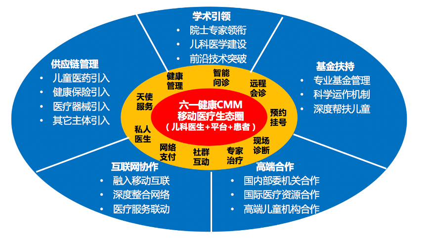 六一健康CMM移動醫(yī)療生態(tài)圈的目標(biāo),是打造國際級兒科移動醫(yī)療O2O醫(yī)聯(lián)體,重點發(fā)力兒科智能問診、遠程會診、預(yù)約輿論、現(xiàn)場診斷、專家治療、社群互動、網(wǎng)絡(luò)支付等兒科診療價值,強化私人醫(yī)生、天使服務(wù)和健康管理等兒科診斷服務(wù),并構(gòu)筑兒科診斷學(xué)術(shù)引領(lǐng)、醫(yī)療基金扶持、高端醫(yī)療合作、互聯(lián)網(wǎng)協(xié)作及兒科醫(yī)療供應(yīng)鏈管理等兒科醫(yī)療生態(tài)圈。