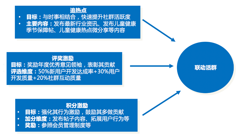第四步:聯(lián)動活群。與時事相結(jié)合,追社會熱點;對社群意見領(lǐng)袖進行評選,獎勵年度優(yōu)秀意見領(lǐng)袖,表彰其優(yōu)質(zhì)貢獻,并以“行為積分”等強化醫(yī)學(xué)帖設(shè)定,提升患者社群參與積極性。