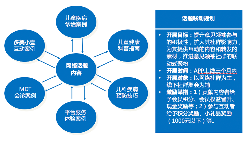 第二步:聚合集粉。通過“網(wǎng)絡(luò)話題互動”活動提升意見領(lǐng)袖的參與度,以大量的兒科醫(yī)學(xué)內(nèi)容、兒童疾病診治案例、兒童健康科普指南、兒科疾病預(yù)防技巧、平臺服務(wù)體驗案例等強化患者聯(lián)動,并以老帶新,實現(xiàn)患者快速集聚。