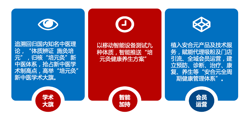 安合元主要經(jīng)銷(xiāo)的是培元灸、藥夫家系列、培元泡浴等產(chǎn)品,其產(chǎn)品的理論依據(jù)是“培元論”,而產(chǎn)品要想有更全面的“升級(jí)”,需要升級(jí)“中醫(yī)學(xué)術(shù)”,導(dǎo)入“九種體質(zhì)”的價(jià)值,根據(jù)九種體質(zhì)因人服務(wù),同時(shí)以“移動(dòng)智能設(shè)備”準(zhǔn)確測(cè)試人的“九種體系”,推動(dòng)商品與用戶(hù)的“智能匹配”。