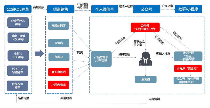 ——全渠道“公域引流”。廣泛布局微信公眾號(hào),聯(lián)絡(luò)公眾號(hào)KOL,進(jìn)行抖音、微博KOL種草,點(diǎn)亮“大健康”小紅書(shū)背書(shū),與線下門(mén)店導(dǎo)購(gòu)種草、資訊分發(fā)等結(jié)合起來(lái),實(shí)現(xiàn)“安合元品牌內(nèi)容”的快速分發(fā),提升品牌關(guān)注度,廣泛吸引粉絲。