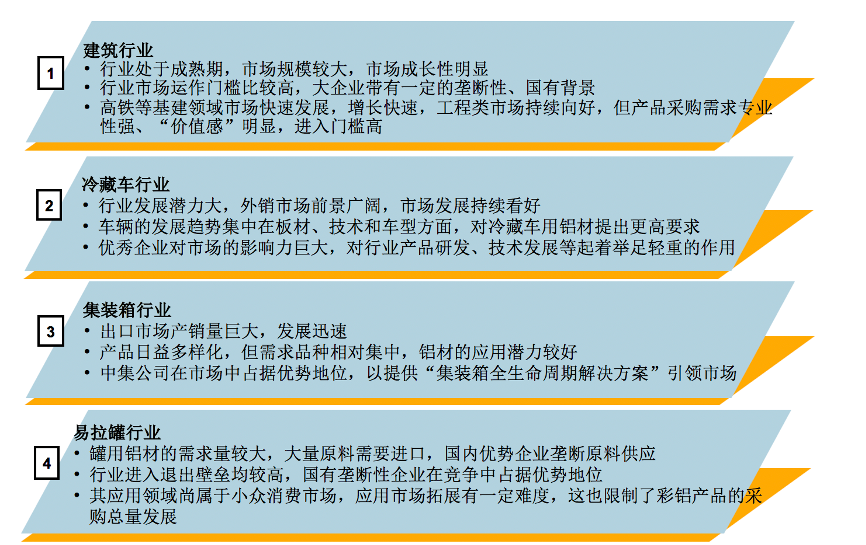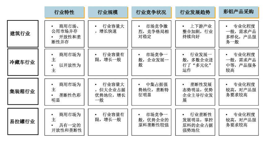 彩鋁應(yīng)用行業(yè)洞察:行業(yè)大多處于成熟期,競爭格局相對穩(wěn)定;大企業(yè)在行業(yè)發(fā)展中占據(jù)優(yōu)勢地位,引領(lǐng)行業(yè)發(fā)展方向;產(chǎn)品采購的專業(yè)性強(qiáng),進(jìn)入難度較大。