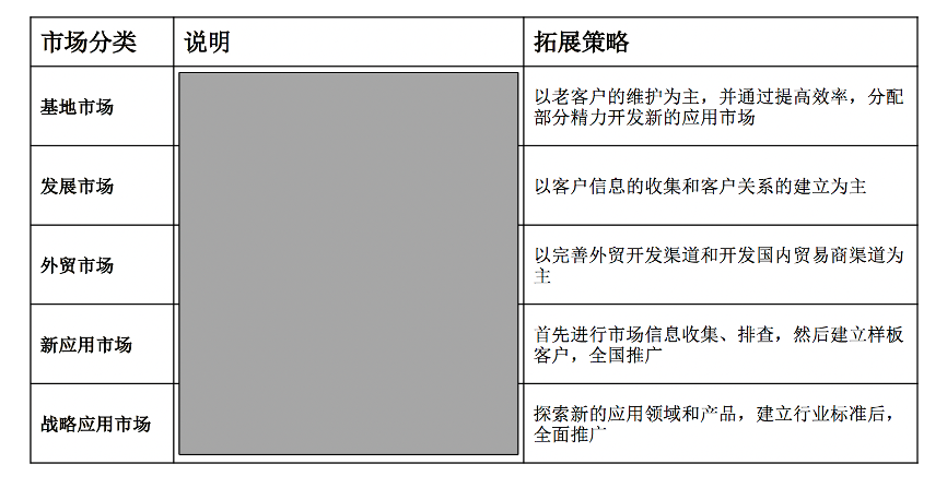 前期重點拓展基地市場和發(fā)展市場,基地市場以“老客戶維護(hù)”為主,并通過提高運(yùn)作效率,分配部分精力開發(fā)新的應(yīng)用市場,而發(fā)展市場則以客戶信息的收集和客戶關(guān)系的建立為主。