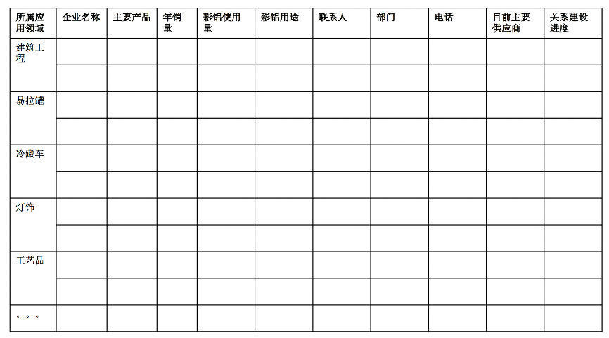 發(fā)展市場的客戶拓展需要我們重點關(guān)注“客戶信息收集及反饋”,強(qiáng)化客戶的銷量、產(chǎn)品用途、核心決策人、目前供應(yīng)商等停牌收集反饋,重點拓展建筑工程、易拉罐、冷藏車和燈飾等各種產(chǎn)品應(yīng)用領(lǐng)域。