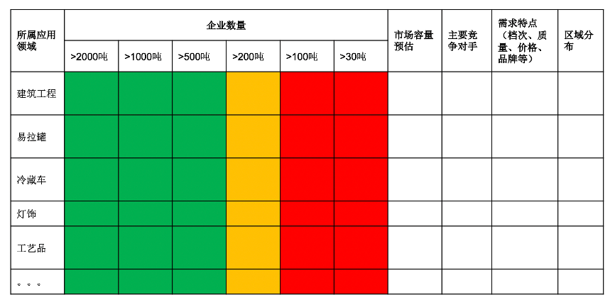 根據(jù)市場的企業(yè)數(shù)量、市場容量、競爭對手情況、需求特點(檔次、質(zhì)量、價格、品牌等)、區(qū)域分布等洞察區(qū)域市場現(xiàn)狀,結(jié)合建筑工程、易拉罐、冷藏車等產(chǎn)品應(yīng)用領(lǐng)域,制訂“市場開拓地圖”,明確市場開發(fā)次序。