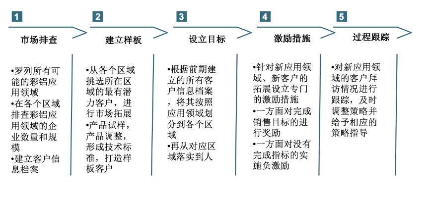 以“彩涂鋁板”為代表的工業(yè)品新應(yīng)用市場拓展應(yīng)該專業(yè)化、規(guī)范化推進(jìn),從基礎(chǔ)的市場排查開始,從各區(qū)域挑選最有潛力的客戶建立樣板市場,設(shè)立各應(yīng)用市場的拓展目標(biāo),以銷售達(dá)成獎勵、專項獎勵等激勵大家達(dá)成指標(biāo),并進(jìn)行過程跟蹤。