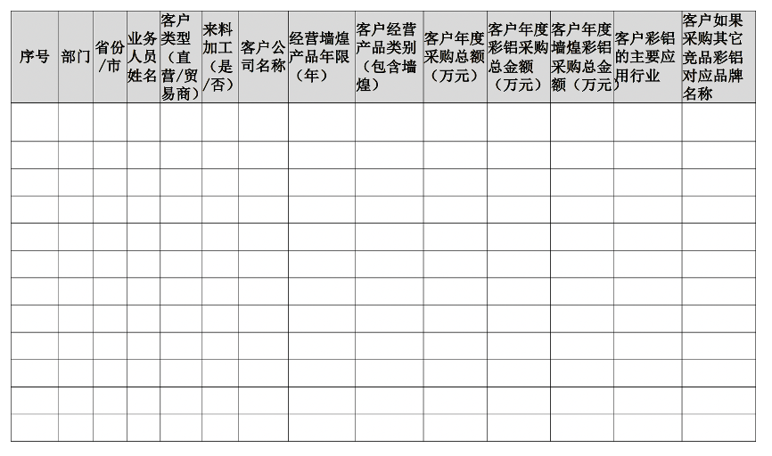 對彩鋁工業(yè)品全渠道客戶進(jìn)行專業(yè)化信息管理,對客戶檔案進(jìn)行及時更新,尤其是彩鋁產(chǎn)品的交易信息、產(chǎn)品類別、采購信息等。