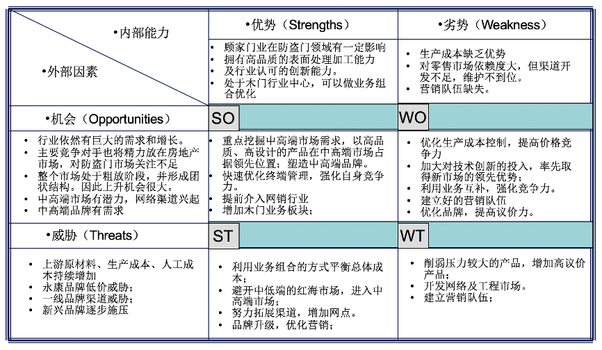 雙方進(jìn)行了深度診斷及剖析,經(jīng)過對(duì)顧家門業(yè)的SWOT分析,一致認(rèn)為:顧家門業(yè)需要逐步轉(zhuǎn)換發(fā)展思路,在穩(wěn)定和強(qiáng)化零售市場(chǎng)的前提下,大力拓展新渠道市場(chǎng),打造營銷團(tuán)隊(duì),同時(shí)在內(nèi)部強(qiáng)化品牌管理及服務(wù)能力。韜慧咨詢合伙人在某公司深度策劃此項(xiàng)目,對(duì)此也深表認(rèn)同。