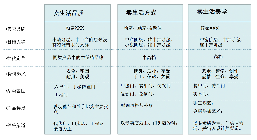 圍繞三大層級(jí)將通過不同的定位和訴求實(shí)現(xiàn)顧家門業(yè)品牌的區(qū)隔,達(dá)到對(duì)目標(biāo)人群的覆蓋。