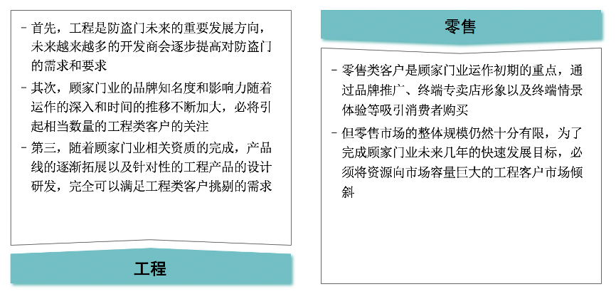 顧家門業(yè)渠道策略總原則應(yīng)是零售渠道以總經(jīng)銷制為主,兼顧工程渠道,但隨著顧家門業(yè)運(yùn)作的不斷深入和品牌影響力不斷加大,并逐漸向工程類客戶傾斜。