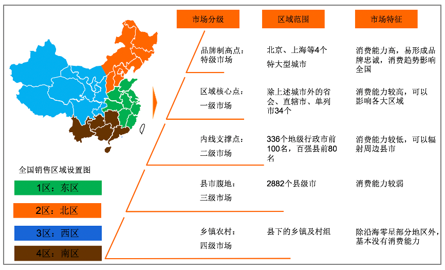 顧家門業(yè)按照行政區(qū)域設(shè)置四個(gè)大區(qū),并根據(jù)全國區(qū)域市場(chǎng)分級(jí)及其市場(chǎng)設(shè)置總市場(chǎng)布局如下:“一線城市全部占領(lǐng)、二線城市全面覆蓋、三四城市保證可見”。