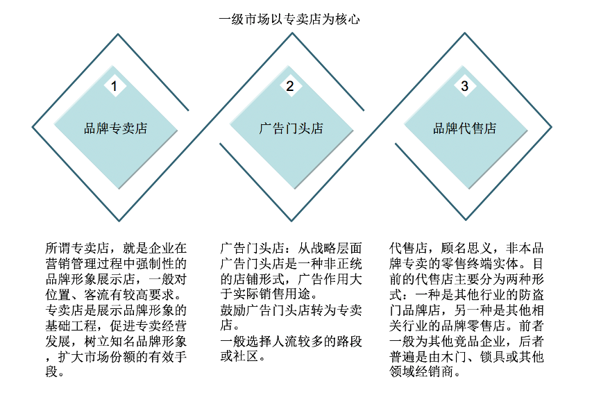 顧家門業(yè)終端策略的大原則是:專賣店為主,門頭店為輔,控制代售店。并從政策上激勵(lì)專賣店,鼓勵(lì)廣告門頭店轉(zhuǎn)為專賣店,爭(zhēng)取代售店成為門頭店。