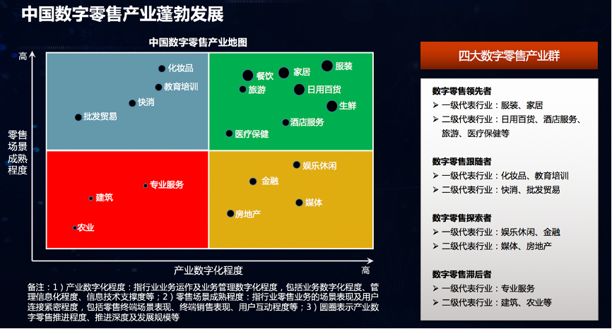 中國零售行業正是在產業數字化程度和零售場景成熟度的驅動下有了新景象,各行業的零售環節有了不同的行業表現,涌現出不同的特色。