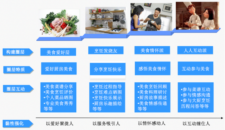 “會員圈層打造四法”之二:積極構建階梯化生鮮美食圈層。通過專業美食分享、美食服務分享、美食故事分享等吸納生鮮美食潛在客戶,構建美食愛好層、烹飪發燒友、美食情懷派、人人互動派等各類生鮮美食圈層,強化客戶黏性,以愛好聚攏人,以服務吸引人,以情懷感動人,以互動纏住人。