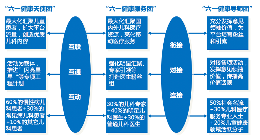 六一健康CMM移動醫療生態圈的目標,是打造國際級兒科移動醫療O2O醫聯體,重點發力兒科智能問診、遠程會診、預約輿論、現場診斷、專家治療、社群互動、網絡支付等兒科診療價值,強化私人醫生、天使服務和健康管理等兒科診斷服務,并構筑兒科診斷學術引領、醫療基金扶持、高端醫療合作、互聯網協作及兒科醫療供應鏈管理等兒科醫療生態圈。