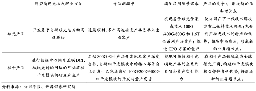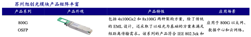 經典案例:根據公司年報、開源證券研究所等綜合資訊表明,蘇州旭創致力于高端光通信收發模 塊的研發、設計、封裝、測試和銷售,產品服務于云計算數據中心、數據通信、 5G 無線網絡、電信傳輸和固網接入等領域的國內外客戶。公司注重技術研發,并推動 產品向高速率、小型化、低功耗、低成本方向發展,為云數據中心客戶提供 100G、 200G、400G 和 800G 的高速光模塊。