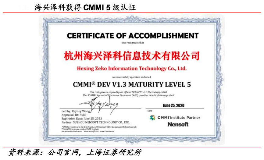 經(jīng)典案例:根據(jù)公司官網(wǎng)、上海證券研究所等綜合資訊表明,海興電力公司全資子公司海興澤科信息技術(shù)有限公司,已獲得國家重點軟件企業(yè)認定,獲得全球最高等級 CMMI 5 級認證,是行業(yè)內(nèi)極少數(shù)可面向全球市場提供高質(zhì)量軟件 集成服務(wù)的企業(yè)。