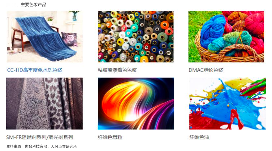 經典案例:根據世名科技官網、天風證券研究所等綜合資訊表明,2018 年開始,世名科技公司在持續優化原有涂料類、膠乳著色等產品技術的基礎上,逐步布局纖維 原液、紡織品綠色著色、特種添加劑等行業新產品。目前,纖維類產品主要包含纖維原液著色色漿、高性能母粒及功能性納米材料等產品,主要應用于紡織纖維領域,基本實現了纖維原液著色技術及相關產品的全覆蓋。