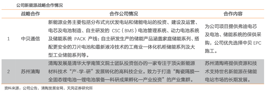 經典案例:根據公司公告、清陶發展官網、天風證券研究所等綜合資訊表明,世名科技公司與中貝通信、清陶等新能源公司近期分別達成戰略合作。2023 年 8 月,公司公告與中 貝通信達成戰略合作,將以新能源的光伏發電和儲能系統業務為主線,全力構建多能互聯、 多業協同、多點盈利的清潔能源生態系統。