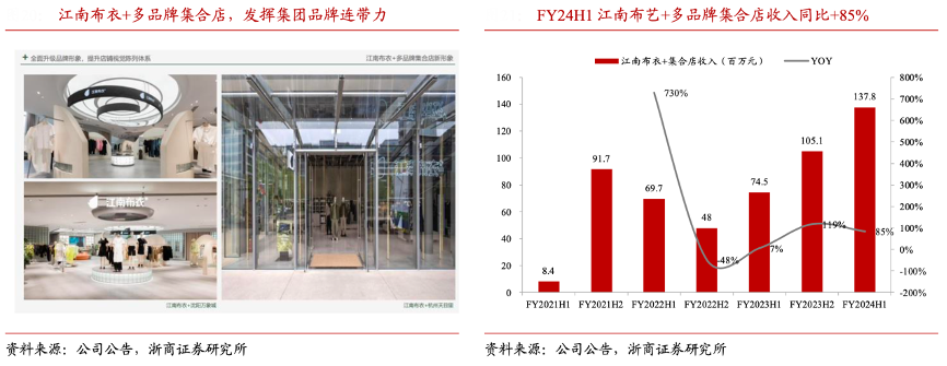 經典案例:根據公司官網、公司小程序、小紅書、微博、浙商證券研究所等綜合資訊表明,江南布衣公司推出江南布衣+多品牌集合店等新興消費場景和產品,通過“不止盒子私人搭配”、“跨品牌會員權益”、“免運費寄送”、“服裝高端洗護”等會員專屬體驗的消費場景,加強粉絲粘性。FY2023H2、FY2024H1 江南布衣+集合店收入同比分別+119%、+85%至 1.05、 1.38 億元,彰顯集團品牌連帶力與新渠道的快速增長。