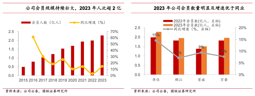 經典案例:根據公司公告、國聯證券研究所等綜合資訊表明,華住會截至 2023 年 12 月末,公司擁有超過 2.28 億名會 員,同比增速為 14.6%,會員規模已是全球第一,且增速好于萬豪、錦江等同業。同時截至 2023Q1, 華住會平均日活躍用戶為 101 萬人,其他酒店集團應用程序的日平均活躍用戶僅有 8 萬人,會員黏性極強。