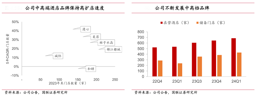 經典案例:根據公司公告、國聯證券研究所等綜合資訊表明,華住集團公司在中高端及以上市場的品牌力在強化,2023 年,公司旗下桔子水晶在連 鎖酒店高端品牌中排名第 5,市占率為 2.2%,公司的漫心品牌也躋身前 10,市占率為 1.2%。
