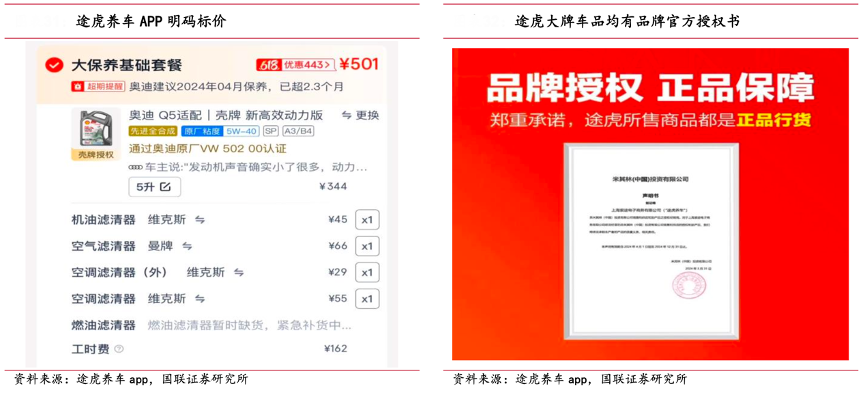 經典案例:根據途虎養(yǎng)車app、國聯(lián)證券研究所等綜合資訊表明,途虎的線上銷售預約+線下標準化服務的創(chuàng)新養(yǎng)車模式上解決了傳統(tǒng) IAM 產品/服務價格不透明的痛點,也省 去了討價還價的過程,用戶通過線上 app 可以詳細了解所有項目的具體收費情況。此外用戶通過 APP 綁定愛車后,系統(tǒng)會根據車型推薦適合的配件,相較于綜合網購平臺節(jié)省了產品橫線對比時間。在產品方面,途虎在售的大牌車品均有品牌的官方授權書。