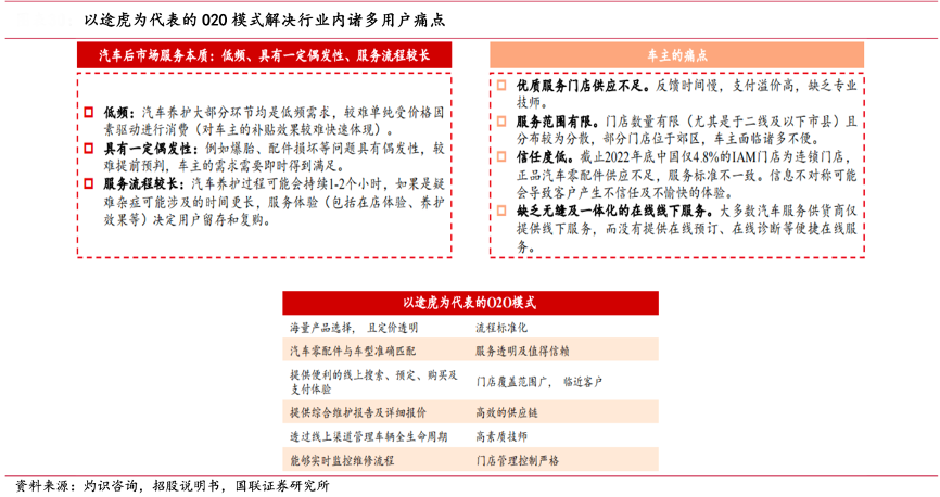 經典案例:根據灼識咨詢、招股說明書、國聯(lián)證券研究所等綜合資訊表明,以途虎為代表的 O2O 模式解決汽車后市場諸多用戶痛點。O2O汽車服務模式將線 上平臺及線下門店的優(yōu)點相結合,線上平臺為線下運營提供龐大的客戶流量及數據分析;線下門店與集中式供應鏈系統(tǒng)合作,采用統(tǒng)一的數字化客戶管理及訂單系統(tǒng),并且線下門店受到平臺的實時嚴格管控。