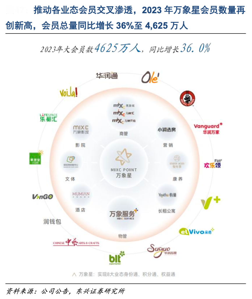 經典案例:根據公司公告、東興證券研究所等綜合資訊表明,華潤萬象生活在2022 年整合資源打通各業態會員系統,發布自有積分品牌“萬象星”,涵蓋營銷、康養、長租、酒店、文體、影業、商業與物業等八大業態,實現各業 態客戶的身份通、積分通和權益通,持續提升會員滿意度與消費貢獻度。截至 2023 年底,萬象星會員總量同比增長 36%至 4,625 萬人。