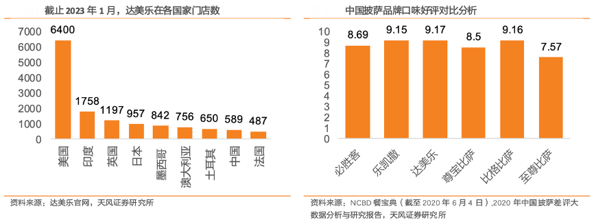 經典案例:根據達美樂官網、NCBD餐寶典、2020年中國披薩差評大數據分析與研究報告、天風證券研究所等綜合資訊表明,達美樂全球授予人 Domino’s Pizza, Inc.為全球最大的披薩公司(按 2022 年的全球零售銷售額計算),截止 2023 年 1 月 1 日,于全球 90 多個市場擁有超過 19,800 家門店。2020 年上半年中國披薩大數據調研中,達美樂以 9.17 的高分位列披薩品牌口味第 一名(必勝客/尊寶披薩 8.69/8.50 分),并以 9.07 的分數在披薩品牌滿意度中位列第二 (必勝客/尊寶披薩 8.66/8.55 分)。