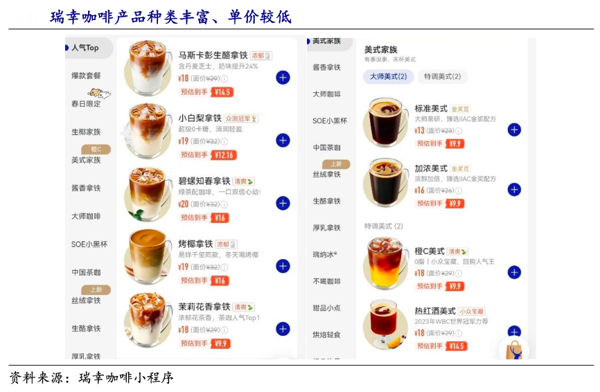 經典案例:根據瑞幸咖啡小程序、開源證券研究所等綜合資訊表明,瑞幸咖啡主要定位“平 價、創新、快取”,將我國現磨咖啡帶入低單價、創新品、輕環境的全新消費場景。在產品價格上瑞幸咖啡定位大眾化、親民化,大多數咖啡產品價格位于 10-20 元價格帶;同時產品類型豐富多樣,包括乳類拿鐵、茶飲咖啡、美式等多樣化產品,滿足消費者對高品質、多元化口味的需求。