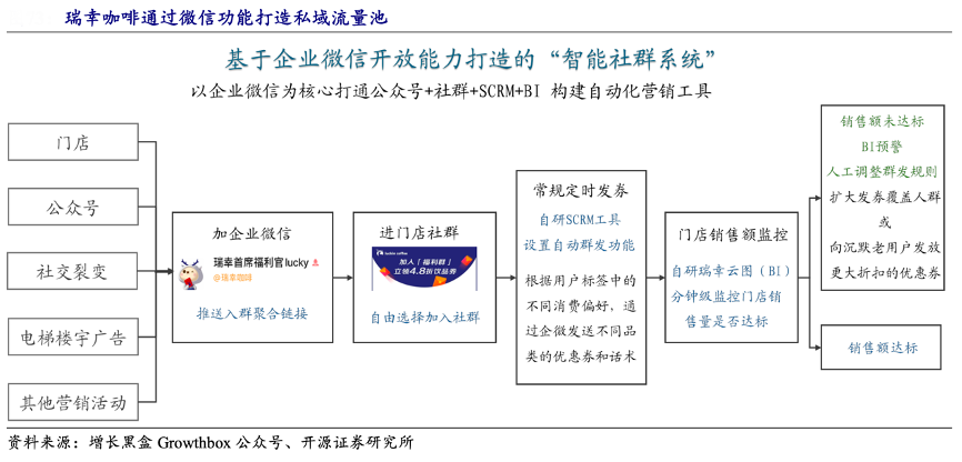經典案例:根據增長黑盒Growthbox公眾號、開源證券研究所等綜合資訊表明,隨著消費人群增加,瑞幸開始通過大量企業微信社群構建用戶私域流量池,并采用積分、優惠券、折扣等獎勵機制,增加用戶的黏性,提高用戶復購率。