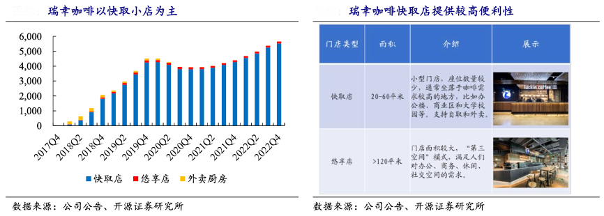 經典案例:根據公司公告、開源證券研究所等綜合資訊表明,瑞幸咖啡門店類型大部分以快取店為主。瑞幸的快取門店集中在咖啡需求量較大的地區,例如寫字樓、商業區和大學校園,同時門店面積小,大部分在 20-60 平方米之間,定位“快咖啡”消費場景。