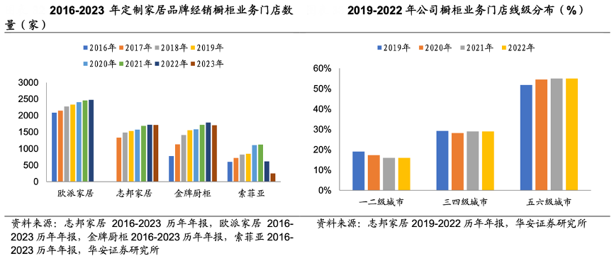 經(jīng)典案例:根據(jù)志邦家居2016-2023歷年年報(bào)、歐派家居2016-2023歷年年報(bào)、金牌櫥柜2016-2023歷年年報(bào)、索菲亞家居2016-2023歷年年報(bào)、華安證券研究所等綜合資訊表明,志邦家居積累了大量?jī)?yōu)質(zhì)經(jīng)銷(xiāo)商與門(mén)店資源,2024Q1 公司櫥 柜經(jīng)銷(xiāo)門(mén)店數(shù)量 1759 家,較 2023 年末增加 44 家,門(mén)店數(shù)量有所擴(kuò)張。從門(mén)店線(xiàn)級(jí)分布來(lái)看,2022 年公司經(jīng) 銷(xiāo)渠道櫥柜業(yè)務(wù)一二級(jí)城市收入占 16%,三四級(jí)城市收入占 29%,五六級(jí)城市收 入占 55%,渠道不斷下沉。