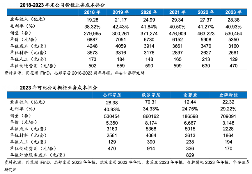經(jīng)典案例:根據(jù)志邦家居2018-2023歷年年報(bào)、志邦家居2023年年報(bào)、歐派家居2023年年報(bào)、索菲亞2023年年報(bào)、金牌櫥柜2023年年報(bào)、同花順iFinD、華安證券研究所等綜合資訊表明,志邦家居公司業(yè)務(wù)規(guī)模持續(xù)擴(kuò)張,2023 年公司櫥柜業(yè)務(wù)毛利率為 40.93%,同期歐派家居/金牌廚柜/索菲亞/皮阿諾/好萊客 廚柜業(yè)務(wù)毛利率分別為 34.33%/29.22%/24.75%/26.95%/26.07%,顯著領(lǐng)先于行業(yè)競(jìng)爭(zhēng)對(duì)手。