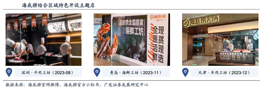 經(jīng)典案例:根據(jù)海底撈官方微博、海底撈官方小紅書、廣發(fā)證券發(fā)展研究中心等綜合資訊表明,海底撈于2023年下半年開(kāi)設(shè)牛肉工坊(深圳卓越店)、海鮮工坊(青島李滄萬(wàn)達(dá)店)、羊肉工坊(天津河?xùn)|萬(wàn)達(dá)店)三家主題店,均為對(duì)原有門店進(jìn)行部分區(qū)域增設(shè)和改造而成。三家主題店均結(jié)合區(qū)域特色,如牛肉工坊主打“鮮牛肉4小時(shí)配送到店”“1牛 10吃”,特點(diǎn)接近潮汕火鍋等。